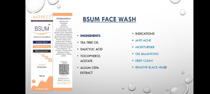 BSUM Anti Acne Face Wash by aABINYY is a gentle foaming cleanser specially designed for individuals with acne-prone skin. This face wash effectively removes excess oil, dirt, and bacteria without stripping or drying out the skin.
