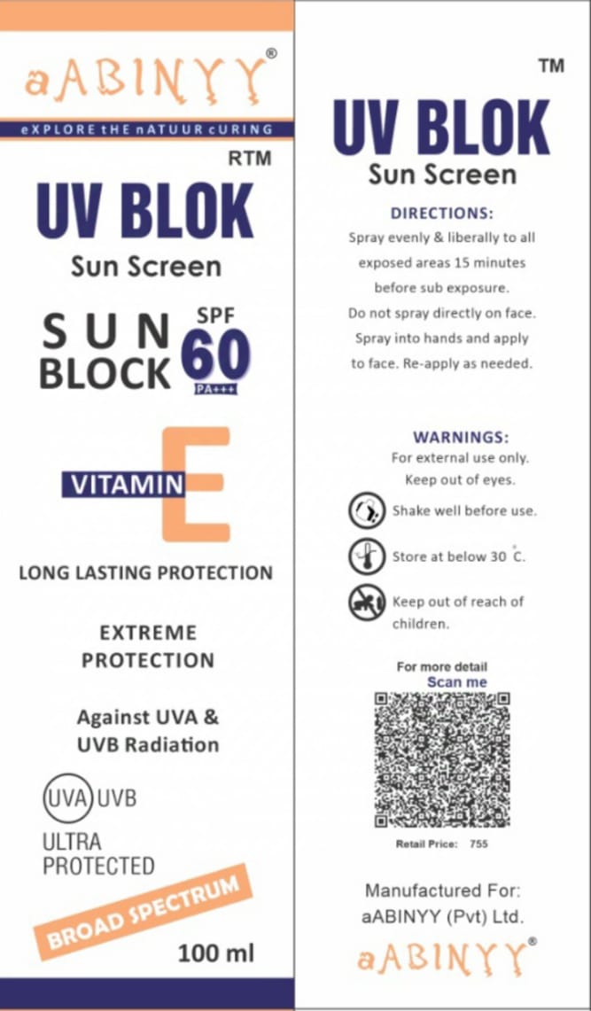 aABINYY UV BLOK™ Sun Screen is a powerful SPF 60 broad spectrum sunscreen spray offering extreme protection against harsh UVA & UVB rays. Enriched with Vitamin E, it not only protects your skin from sun damage but also nourishes it.